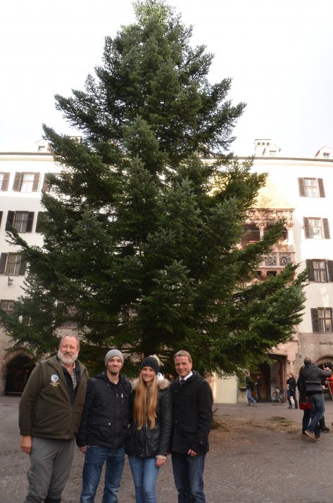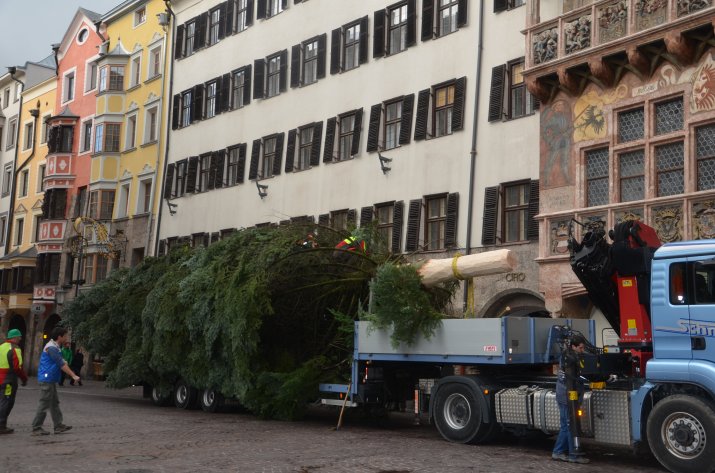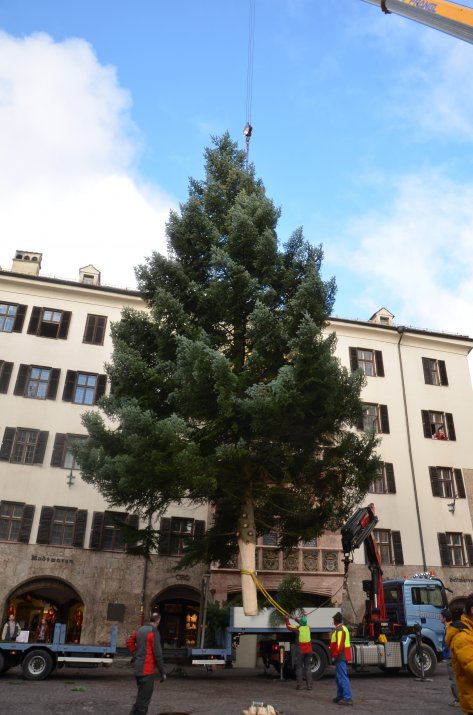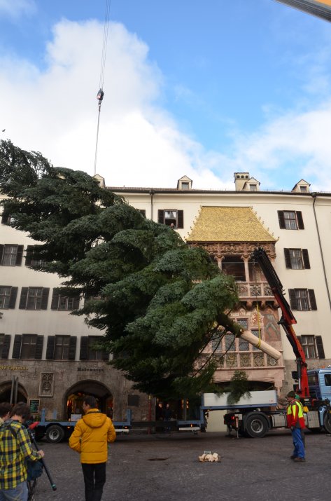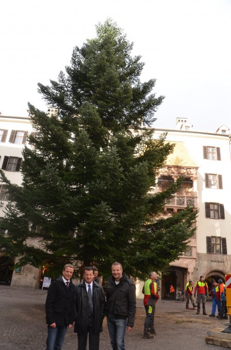 Auch heuer bildet er wieder den sichtbaren Mittelpunkt der Innsbrucker Christkindlmärkte: Der Christbaum am Vorplatz des Goldenen Dachls. Am 5. November wurde die ca. 20 Meter hohe, 42 Jahre heimische Weißtanne aus Gärberbach vom Amt für Land- und Forstwirtschaft der Stadt Innsbruck aufgestellt.