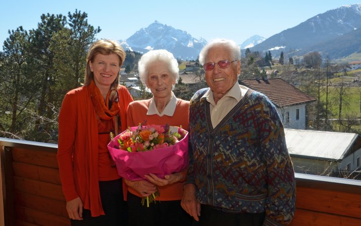 In Vill, am Fuße des Patscherkofels, nahmen Filomena und Josef Mair Bürgermeisterin Mag.a Christine Oppitz-Plörer in Empfang. Diese besuchte das Jubelpaar anlässlich der Eisernen Hochzeit und überbrachte Glückwünsche im Namen der Stadt, einen Blumenstrauß sowie eine Flasche Wein.