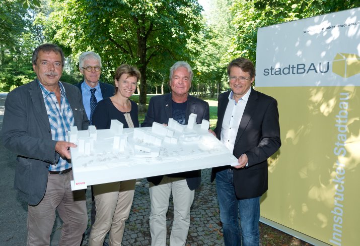Nach umfangreichen Vorarbeiten ist es so weit: Die Innsbrucker StadtBAU GmbH. – eine Tochter der Neuen Heimat Tirol und der Stadtgemeinde - errichtet im Auftrag der Stadtgemeinde Innsbruck bzw. der Innsbrucker Sozialen Dienste (ISD) ein Wohn- und Pflegeheim in der Innsbrucker An der Lan-Straße. Innsbrucks Bürgermeisterin Mag. Christine Oppitz-Plörer, Stadtrat Mag. Gerhard Fritz sowie die Geschäftsführer der Innsbrucker StadtBAU, Dir. Hannes Gschwentner und Prof. Dr. Klaus Lugger, präsentierten anlässlich des unmittelbar bevorstehenden Baubeginns im O-Dorf die Details.