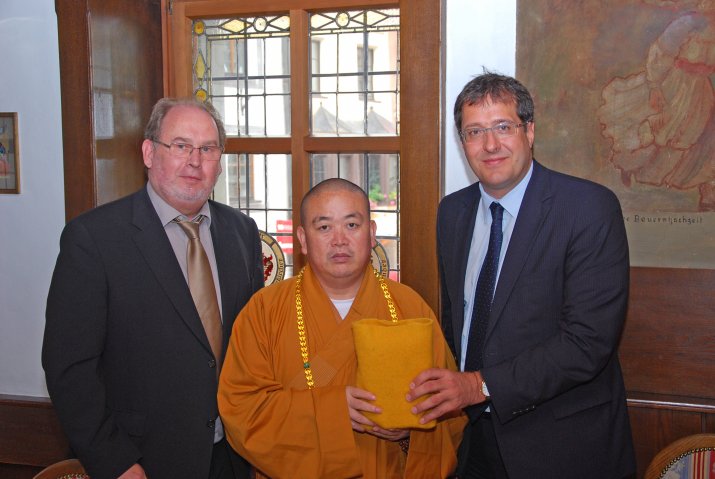 (RMS) Er ist das geistliche Oberhaupt von über 300 Millionen Zen-Buddhisten – und der oberste Abt des weltweiten buddhistischen Shaolin-Ordens. Zwischen einem Besuch bei US-Außenministerin Hillary Clinton und der bevorstehenden Reise nach Moskau zu Ministerpräsident Wladimir Putin, besuchte Abt Shi Yongxin gestern Innsbruck. Vizebgm. Franz X. Gruber begrüßte Seine Heiligkeit gemeinsam mit GR Martin Krulis im Restaurant „Goldener Adler“, wo sich die Gäste-Delegation, der auch Dr. Ding Ding (Koordinator des Abtes für Shaolin-Angelegenheiten in Europa) angehörte, für die Stadtführung mit rein vegetarischer Kost stärken konnte.