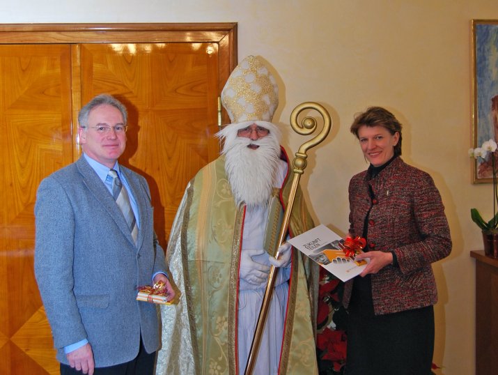 (RMS) Am 6. Dezember kehrte im Rathaus Adventstimmung ein: Der Nikolaus besuchte Bürgermeisterin Mag.a Christine Oppitz-Plörer in ihrem Büro und überbrachte vorweihnachtliche Glückwünsche. Gemeinsam mit Magistratsdirektor Dr. Bernhard Holas freute sie sich über sein festliches Gedicht, das auch auf die Aktion „Bruder und Schwester in Not“ der Diözese Innsbruck aufmerksam machte.
