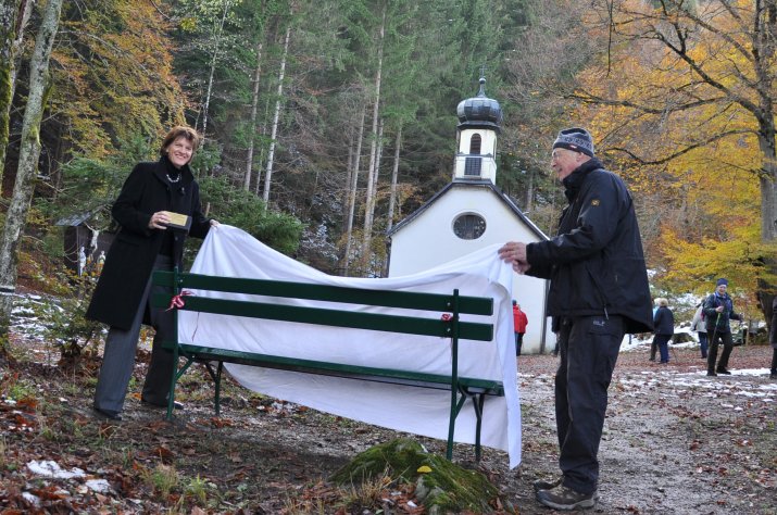 (RMS) „Die Wallfahrtskirche Höttinger Bild ist ein schöner und besonderer Ort“, freute sich Bürgermeisterin Mag.a Christine Oppitz-Plörer über den Standort der Ruhebank, die ihr der Innsbrucker Verschönerungsverein widmete. Hier seien einerseits das Ziel für zahlreiche erholungssuchende Spaziergänger und andererseits der Ausgangspunkt für große Bergtouren. Gemeinsam mit Vereins-Obmann Hermann Hell enthüllte die Bürgermeisterin am 28. Oktober „ihre“ Bank und schraubte danach auch selbst das Widmungsschild an.