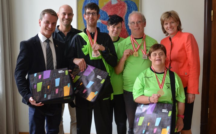 Ganz besonders herzlich empfangen wurden drei Tiroler MedaillengewinnerInnen am 14. Juli im Innsbrucker Rathaus von Bürgermeisterin Mag.a Christine Oppitz-Plörer, Vizebürgermeister Christoph Kaufmann und Amtsvorstand Romuald Niescher. Bernhard Gruszka (Leichtathletik), Sascha Maikl (Leichtathletik) und Barbara Badstuber (Schwimmen), begleitet von Bettina Kahlhammer (Lebenshilfe Mobile Betreuung), wurde zum großartigen Erfolg bei den „Special Olympics Sommerspielen Klagenfurt 2014“ gratuliert.