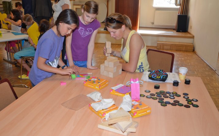 In kleinen Gruppen, unterstützt von Mathematik-Studierenden, wurden die Schulkinder motiviert, in verschiedenen Stationen spielerisch Probleme zu lösen, überraschende Phänomene kennen zu lernen und damit die die Freude an der Mathematik zu entdecken oder zu stärken. Rätseln und Knobeln konnten die Kids bei: