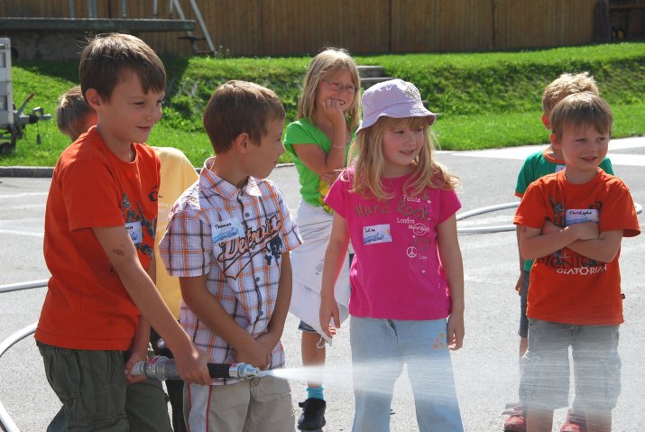 Das Ferienzugprogramm ist vielfältig, die Kinder können sich sportlich, kreativ oder auch als kleine Wissenschaftler betätigen. „Der Besuch von Blaulichtorganisationen ist sehr beliebt“, weiß Birgit Hofbauer vom städtischen Referat für Kinder und Jugendförderung. Daher war natürlich auch der Besuch bei der Berufsfeuerwehr am 10. August sehr gefragt. Feuerwehrmann Bernhard Egger erzählte den Ferienzuggästen anschaulich alles rund um die Feuerwehr und das Verhalten im Notfall. Die Kinder erfuhren dabei, dass die Feuerwehr nicht nur kommt, wenn es brennt, sondern auch bei Autounfällen, Hochwasser, etc. Feuerwehrautos wurden besichtigt und sogar „hineinkraxeln“ war erlaubt. Auch einen echten Alarm erlebten die jungen Gäste und staunten, wie flink die Berufsfeuerwehrmänner mit dem Einsatzfahrzeug davonbrausten. Höhepunkt des zweistündigen Programms waren aber eindeutig die Löschübungen, bei denen es galt, zielgenau zu spritzen und mit einem Feuerlöscher echte Flammen zu bekämpfen.