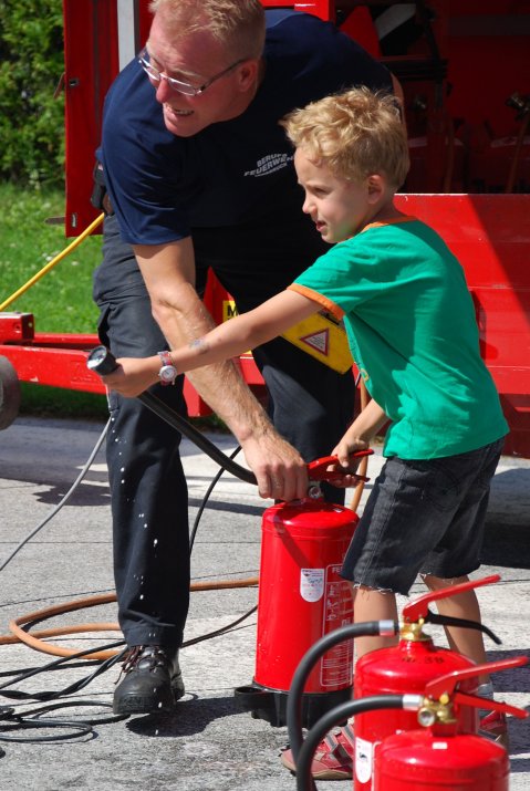 Auf Feuerwehrautos kraxeln, Einsatzbekleidung anprobieren, ein echtes Feuer bekämpfen und dabei Wissenswertes über die Feuerwehr erfahren.