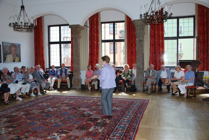 Am 28. Juni begrüßte Gemeinderätin Gerti Mayr im Bürgersaal des Historischen Rathauses ca. 30 Mitglieder der Gesellschaft zur Förderung der Städtepartnerschaften Freiburgs e.V., die im Rahmen einer Bürgerreise für einige Tage die Landeshauptstadt Innsbruck besuchten: „Es ist schön, dass wir BürgerInnen unserer Partnerstadt zu Gast haben. Sie sollen sich bei uns wie zu Hause fühlen.“