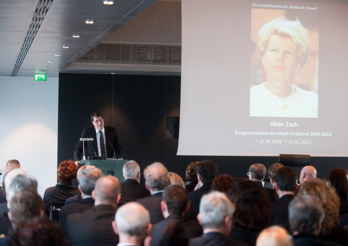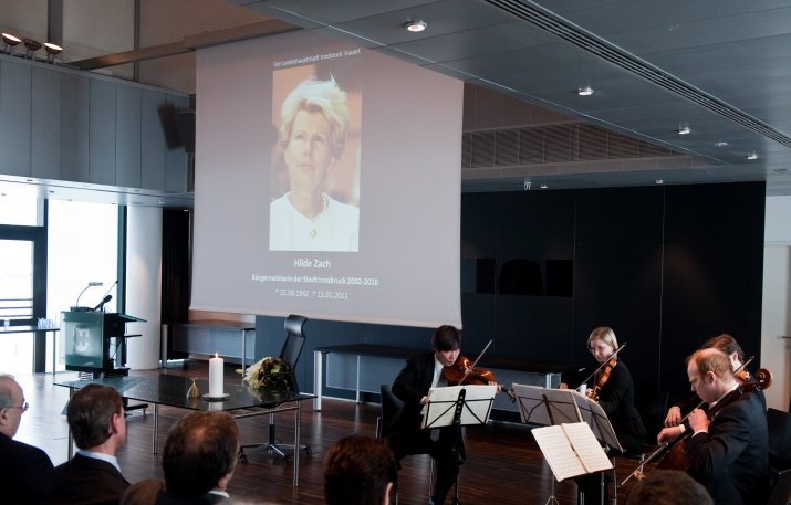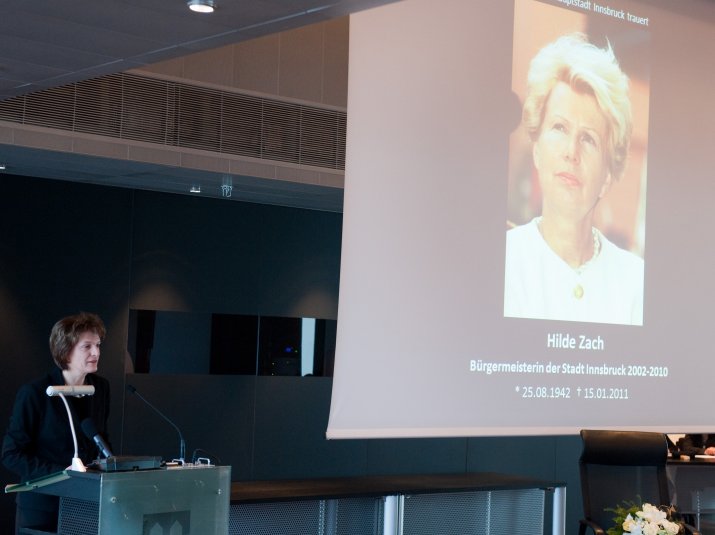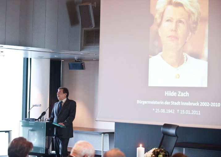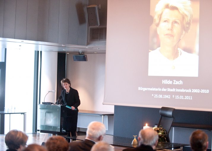 Bürgermeisterin Mag.a Christine Oppitz-Plörer dankte ihrer verstorbenen Amtsvorgängerin in einer bewegenden Rede für ihr Lebenswerk: „Hilde Zach ist mutig und konsequent ihren ganz eigenen Weg gegangen und hat viele sichtbar und spürbare Spuren in unserer Stadt hinterlassen. Sie war wesentlicher Motor, Innsbruck ein modernes Gesicht und ein weltoffenes Lebensgefühl zu geben.“ Hilde Zach habe sich mit ihrem unbändigen und umsichtigen Einsatz für die Agenden der Stadt und der immer spürbaren Sympathie, die sie den Menschen entgegen brachte, in den acht Jahren als Bürgermeisterin der Tiroler Landeshauptstadt die Liebe der Innsbruckerinnen und Innsbrucker im wahrsten Sinne des Wortes erarbeitet. „Wirtschaft mit Weitblick, Kultur als Herzensangelegenheit und Politik aus Leidenschaft – Hilde Zach zeichnete sich in allen Bereichen, in denen sie tätig wurde, durch herausragende Leistungen aus. Das brachte ihr großen Respekt ein, weit über alle Parteigrenzen hinweg“, so Bürgermeisterin Oppitz-Plörer. Hilde Zach habe mit ihrer pflichtbewussten Auffassung von Politik der Innsbrucker Stadtpolitik und dem Gemeinderat ein neues Selbstbewusstsein gegeben. „Hilde Zach war Bürgermeisterin mit Leib und Seele: Sie lebte die Politik, sie mochte die Menschen und sie liebte ihre Stadt, ihr Innsbruck! Ihr leidenschaftlicher Einsatz für Innsbruck, ihr Mut und Rückgrat, ihr Durchsetzungsvermögen und nicht zuletzt ihr soziales Wirken, ihr Verständnis, ihre Toleranz und ihrer Hilfsbereitschaft waren beispielhaft.“