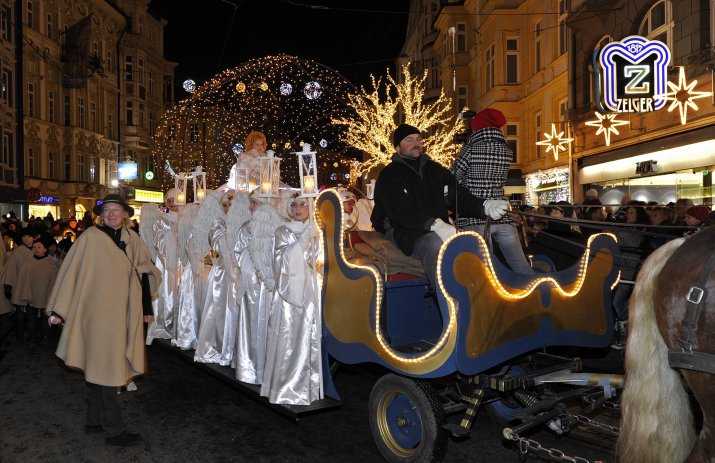 Um 17 Uhr setzt sich dann der feierliche Zug in Bewegung. Von der Triumphpforte führt der Weg über Maria-Theresien-Straße, Marktgraben, Herzog-Otto-Straße und Herrengasse bis zum Platz vor dem Tiroler Landestheater und bietet so reichlich Gelegenheit, den gesamten Zug zu bestaunen. Die Hirten und Engel mit ihren Laternen bringen einen warmen Lichterglanz in die Innenstadt und bereiten den Weg für das Christkind in seinem strahlenden, prunkvollen Wagen. An zwei Stationen (Rathaus, ca. 17.20 Uhr, und Marktplatz, ca. 17.40 Uhr) werden die traditionellen Lieder „Jetzt fangen wir zum Singen an“, „Kommet ihr Hirten“ und „Es wird scho glei dumpa“ gesungen, die sich als vorweihnachtliche Klangwolke über die Innsbrucker Innenstadt legen.