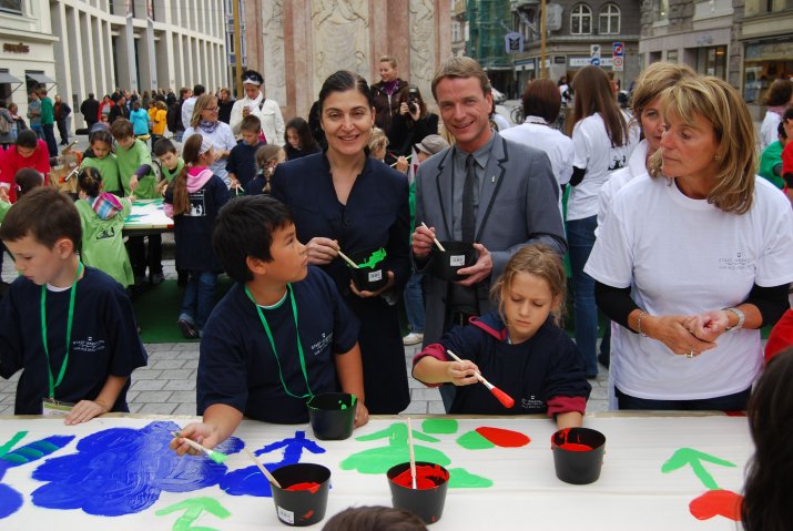 (RMS) Buntes Treiben vor dem Rathaus: Rund 100 Kinder aus den Innsbrucker Schülerhorten versammelten sich in der Maria-Theresien-Straße, um Stoffbahnen mit bunten Blumen zu bemalen. Diese werden in Folge vom Balkon des Rathauses wehen und damit die Fußgängerzone verzieren. Vizebürgermeister Christoph Kaufmann und Stadträtin Dr. Patrizia Moser begrüßten die Kinder und ihre BetreuerInnen bei angenehmem Herbstwetter.