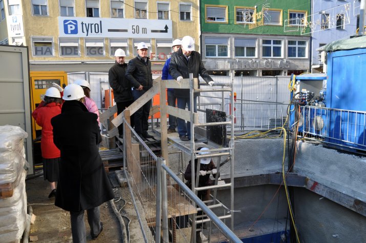 Der unterirdische Kanalvortrieb, der seit Jänner 2011 im Zuge der Kanaloffensive 2020 der Innsbrucker Kommunalbetriebe AG realisiert wird, ist mittlerweile am Bozner Platz angelangt. Um sich von den Bauarbeiten tief unter der Oberfläche selbst ein Bild zu machen, besichtigte Bürgermeisterin Mag.a Christine Oppitz-Plörer mit zahlreichen Mitgliedern des Innsbrucker Gemeinderates am 24. November die Baustelle am Bozner Platz.