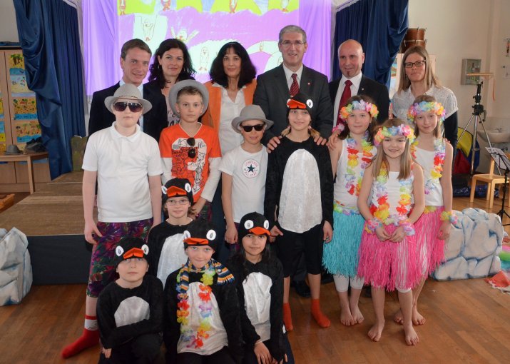 Gemeinsam mit Bezirksschulinspektor Wolfgang Haslwanter und Dr. Karin Zangerl (Amt für Familie, Bildung und Gesellschaft) folgte Vizebürgermeister Christoph Kaufmann am 20. März der Einladung in die Volksschule Allerheiligen. Die Kinder der 3a- und 4a-Klasse luden zur Vorführung des Kindermusicals „Tim Pinguin auf Reisen“.