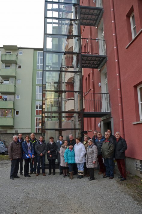 Um den Zugang zu den Wohnungen einfacher und komfortabler zu gestalten, wurden auf Wunsch der MieterInnen und nach einer Erhebung der Innsbrucker Immobilien Gesellschaft (IIG) Aufzugsanlagen im Sennblock errichtet. Wohnungsreferent Vizebürgermeister Christoph Kaufmann überzeugte sich am 23. Jänner gemeinsam mit Amtsvorstand Ing. Ronald Depaoli (Wohnungsservice) und IIG-Geschäftsführer Dr. Franz Danler vom fertiggestellten Aufzugsanbau. Auch zahlreiche MieterInnen sowie Bauleiter Martin Kiechl (IIG) und Sandra Krösbacher (Hausverwaltung Saggen) nahmen die Anbauten in Augenschein.