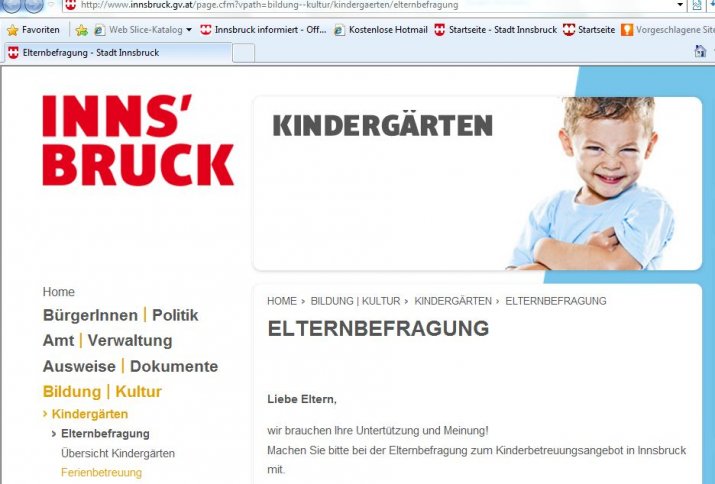 Um das ganzjährige und ganztägige Kinderbetreuungsangebot der Stadt Innsbruck weiterhin bedarfsgerecht auszubauen und zu verbessern, führt die Stadt Innsbruck, Amt für Kinder und Jugendbetreuung, ab sofort bis zum 15. Dezember eine Online-Elternbefragung auf www.innsbruck.gv.at/elternbefragung durch.
