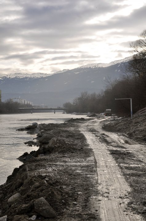 Parallel zum Bau des Altarmes werden momentan an der orographisch rechten Innseite auf einer Länge von rund 250 Metern Eintiefungen der Innsohle aufgefüllt, die sich flussaufwärts der Grenobler Brücke befinden und die für die Hochwasserschutz-Maßnahmen ein ernstzunehmendes Problem darstellen: Mit der Zeit könnten nämlich im Bereich dieser bis zu 5 Meter tiefen Kolken die Uferschutzbauten unterschwemmt werden, wodurch der Schutz vor einem Hochwasser nicht mehr im erwünschten Maße gegeben wäre.