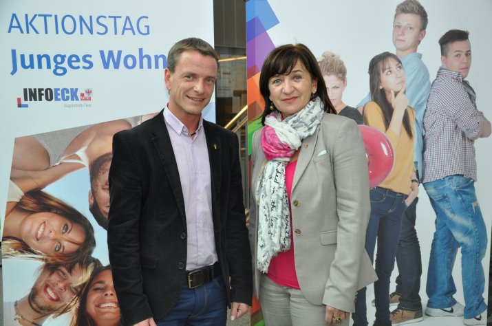 Am 08. Oktober wurde der erste gemeinsame Aktionstag von Land Tirol und Stadt Innsbruck zum Thema Junges Wohnen beim Bürgerservice in den RathausGalerien veranstaltet. Bei der Infoveranstaltung standen InfoEck-Jugendinfo Tirol und das städtische Amt für Wohnungsservice, der Mieterschutzverband, die Mietervereinigung und die Österreichische Hochschülerschaft jungen Menschen mit Antworten in Wohnfragen zur Verfügung. Eröffnet wurde die Veranstaltung von Landesrätin Dr.in Beate Palfrader und Vizebürgermeister Christoph Kaufmann.