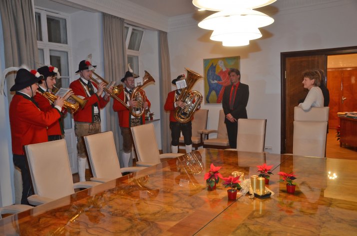 Weihnachtsbläser der Stadtmusikkapelle Wilten verbreiteten am 19. Dezember vorweihnachtliche Stimmung im Innsbrucker Rathaus: „Das ist eine liebgewonnene Tradition“, bedankte sich die Bürgermeisterin für das Weihnachtsständchen im Stadtsenatssitzungszimmer.