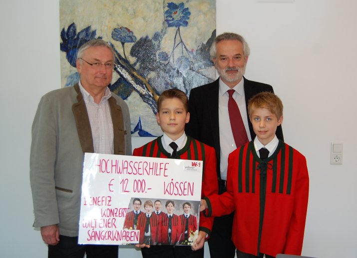 Am 14. Juni konnte Johannes Stecher gemeinsam mit zwei Sängerknaben dem Bürgermeister von Kössen einen symbolischen Scheck über 12.000 Euro überreichen. Ein Drittel des Betrages stammt aus den Konzerteinnahmen (Eintrittsgelder und Spenden), ein Drittel hat das Stift Wilten beigetragen und weiteres Drittel die Stadt Innsbruck.