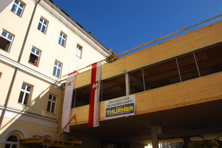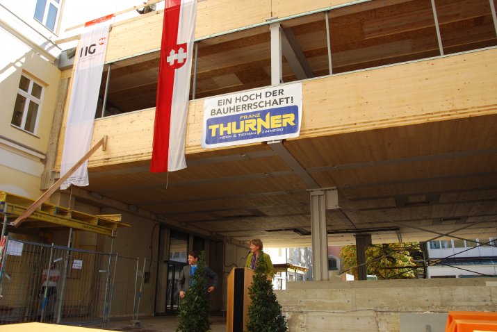 Die Gebäudeerweiterung des BG/BRG Adolf-Pichler-Platz geht zügig voran, wovon sich Bürgermeisterin Mag.a Christine Oppitz-Plörer und Dr. Franz Danler, (Geschäftsführer Innsbrucker Immobilien GmbH) bei der Firstfeier am 17. Oktober persönlich überzeugen konnten.