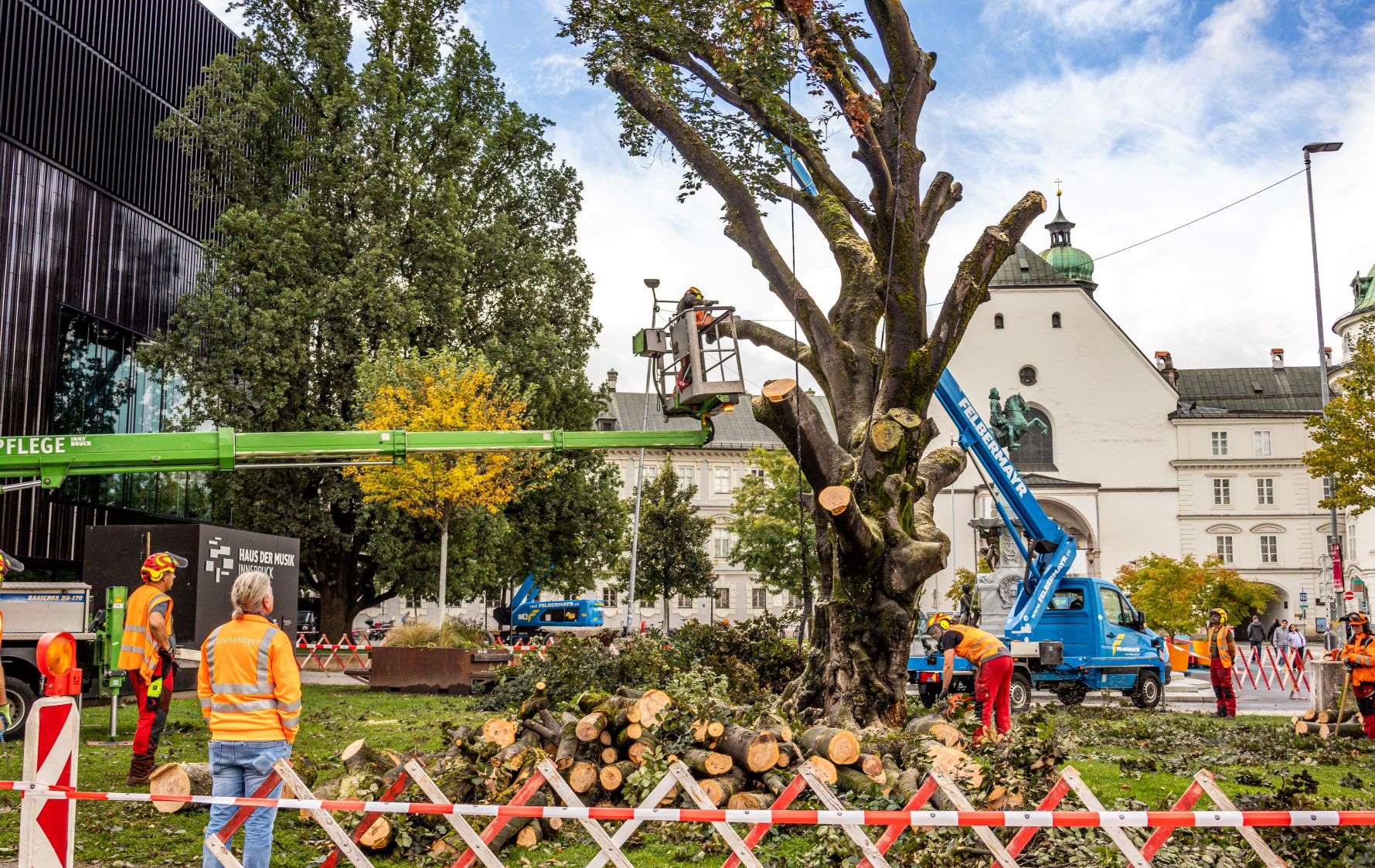 Die Stadt Innsbruck hat in den vergangenen Jahren alles unternommen, um die 120 Jahre alte Blutbuche vor dem Haus der Musik zu erhalten. Unter anderem sollten gezielte Bewässerung und Bodenverbesserung mit Mikroorganismen lebensverlängernd wirken. Zum Erhalt der Stand- und Bruchsicherheit wurden zudem mehrere Kronensicherungen an seitlichen Starkästen angebracht und abgestorbene Äste regelmäßig entfernt. Nun haben die jüngsten Begutachtungen der stadtinternen und externen Sachverständigen ergeben, dass sich die bereits im Jahr 2021 festgestellte holzzerstörende Pilzerkrankung massiv ausgebreitet hat.