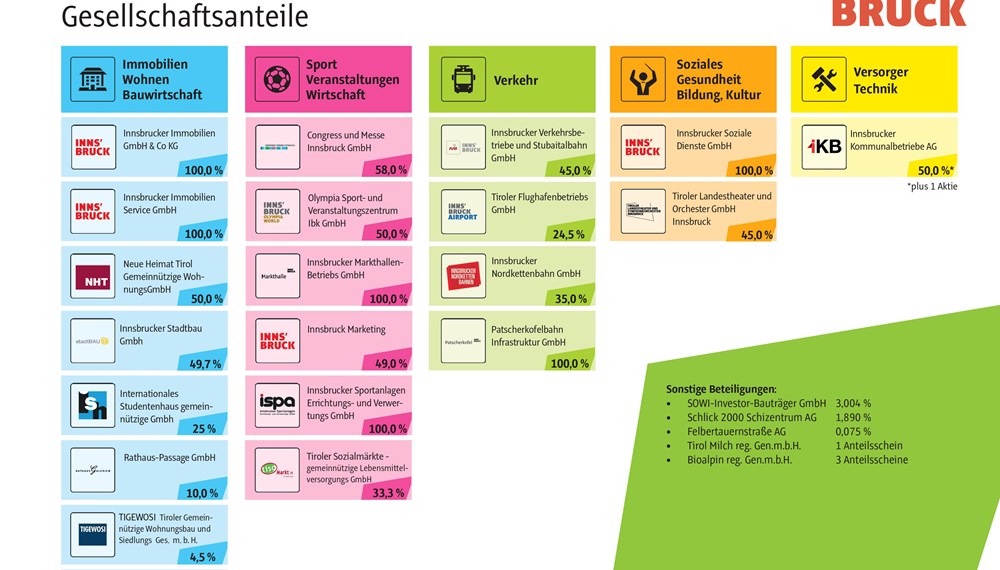 Die Kategorien der Bereiche, in denen Beteiligungen vorliegen, sind breit gefächert: Verkehr, Sport/Veranstaltungen/Wirtschaft, Versorger/Technik, Soziales/Gesundheit/Bildung/Kultur, Immobilien/Wohnen/Bauwirtschaft. Das privatwirtschaftliche Engagement hört keineswegs an Stadtgrenzen auf – Innsbruck hat unter anderem kleinere Anteile am Schlick 2000 Schizentrum, der Felbertauernstraße sowie der Tirol Milch. Ermöglicht wird eine Mitwirkung im privaten Bereich durch das Bundes-Verfassungsgesetz (B-VG), das besagt, dass Bund, Länder und Gemeinden Vermögen besitzen und am Wirtschaftsleben teilnehmen dürfen.