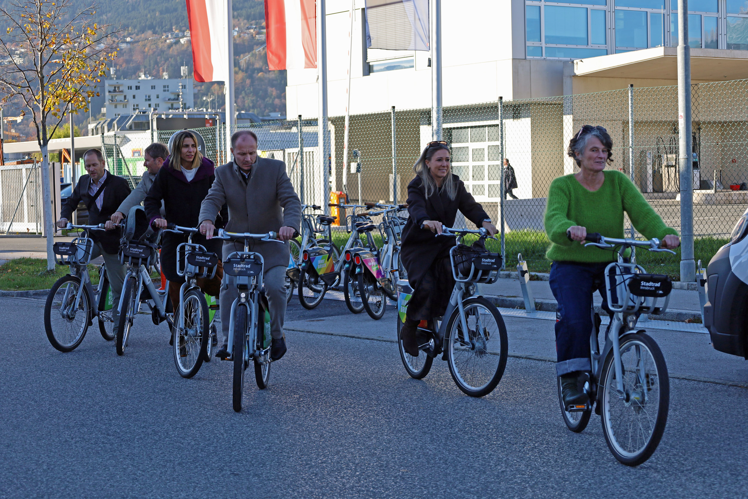 Im Zuge der Eröffnung und im Vorfeld des Pressegesprächs unternahmen die VertreterInnen der Stadt Innsbruck, der IVB, des Quartiersmanagements Rossau und der Firma Leonhard Lang GmbH eine erste gemeinsame Testfahrt mit den neuen Stadträdern – von der Station in der Valiergasse bis zur Station am Grabenweg, wo anschließend das Pressegespräch fortgesetzt wurde.
