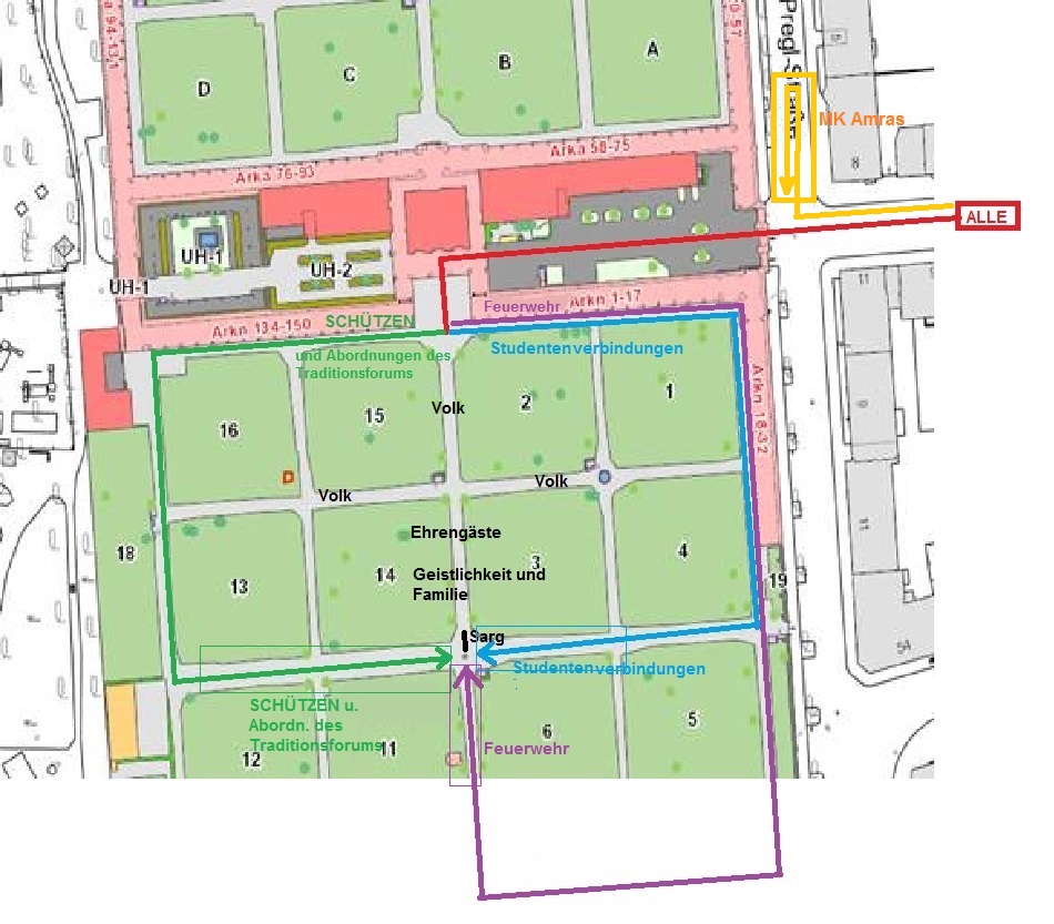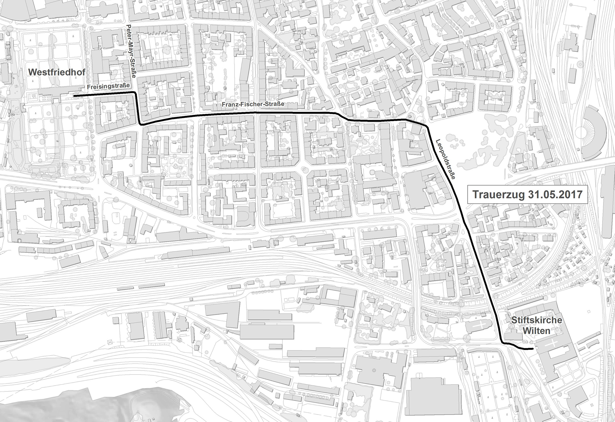 Aufgrund des Begräbnisses mit anschließendem Trauerzug zum Westfriedhof kommt es zu einzelnen Verkehrsbehinderungen: So ist die Klostergasse zwischen 15:30 und 17:00 Uhr gesperrt (Straßenbahn-Linie 1 fährt bis zum Stubaitalbahnhof), ab 16:30 Uhr kommt es zu Verkehrsanhaltungen in der Leopoldstraße, Franz-Fischer-Straße, Peter-Mayr-Straße und Freisingstraße für jeweils bis zu 20 Minuten. Der Verkehr wird nach Möglichkeit kleinräumig umgeleitet. DH