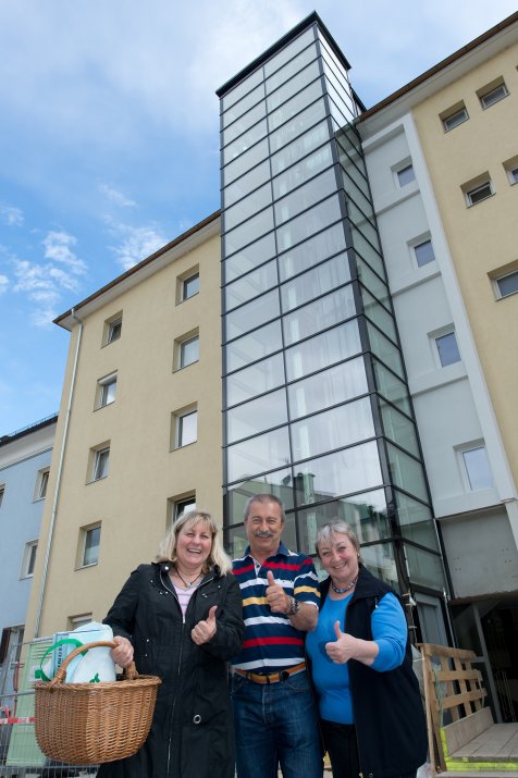Den neu gewonnen Komfort bestätigen die Bewohnerinnen und Bewohner in Egerdach. Beatrix Holy (links im Bild): Ich lebe im vierten Stock daheim und bin froh, dass die mühselige Schlepperei nach dem Einkaufen nunmehr vorbei ist.“ Auch Michael und Gerda Jilly, sie wohnen im dritten Stock, sind angetan: „Die Baufirma Thurner hat sehr sauber gearbeitet. Jetzt ist unser Haus und unsere Wohnung sicher aufgewertet.“